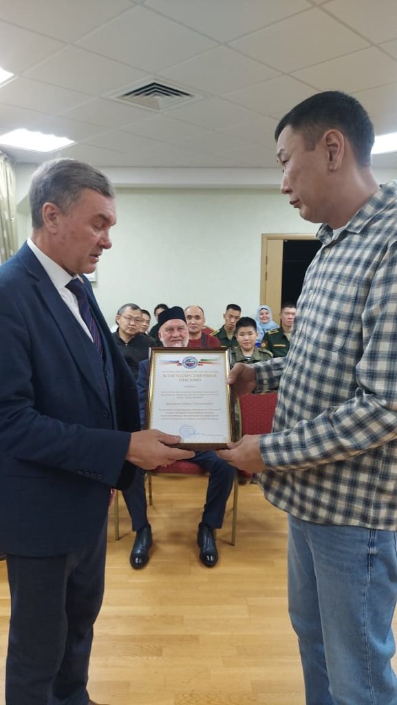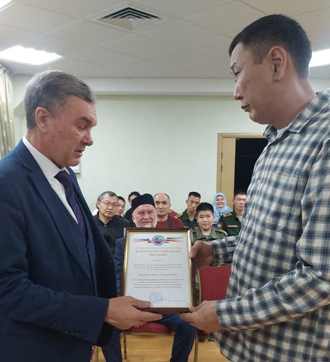Руководитель Исполкома Совета Ассамблеи народов Татарстана, депутат Госсовета РТ Ренат Валиуллин вручил благодарственное письмо от имени председателя Государственного Совета Республики Татарстан Фарида Мухаметшина заместителю председателя местной общественной организации «Национально-культурная автономия бурят города Казани» Датханову Павлу за активную общественную деятельность и большой вклад в оказание гуманитарной помощи военнослужащим, находящимся на специальной военной операции по защите жителей Донбасса.
